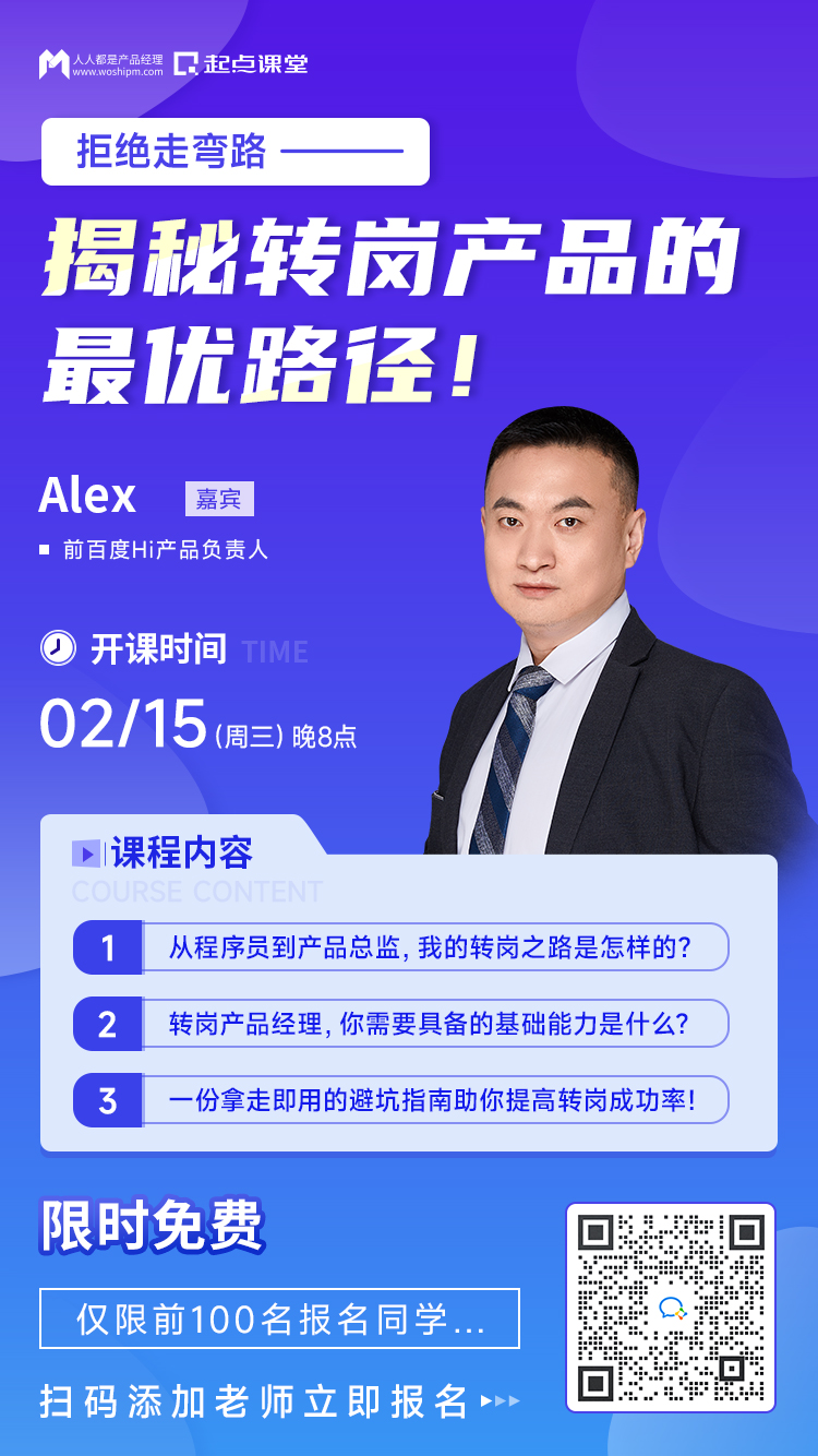 我们特邀前百度Hi产品负责人@Alex老师在线直播,剖析老师从程序员到产品总监的亲身经历,帮你规避转岗产品大坑,教你如何提升转岗产品经理必备的基本能力!