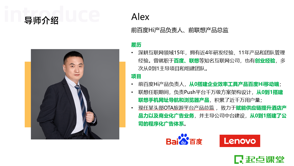 本次授课老师为前百度Hi产品负责人@Alex老师,老师深耕互联网领域16年,拥有近4年研发经验、12年产品和团队管理经验。