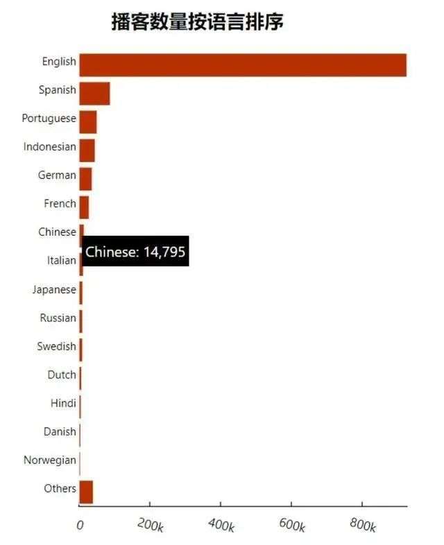 据播客搜索引擎 Listen Notes 数据统计,直到 2020 年 5 月,中文播客的数量才刚刚超过1万个,英文播客则多达83万个。在市场规模上,国内外播客广告市场的规模也相差约十倍之大。