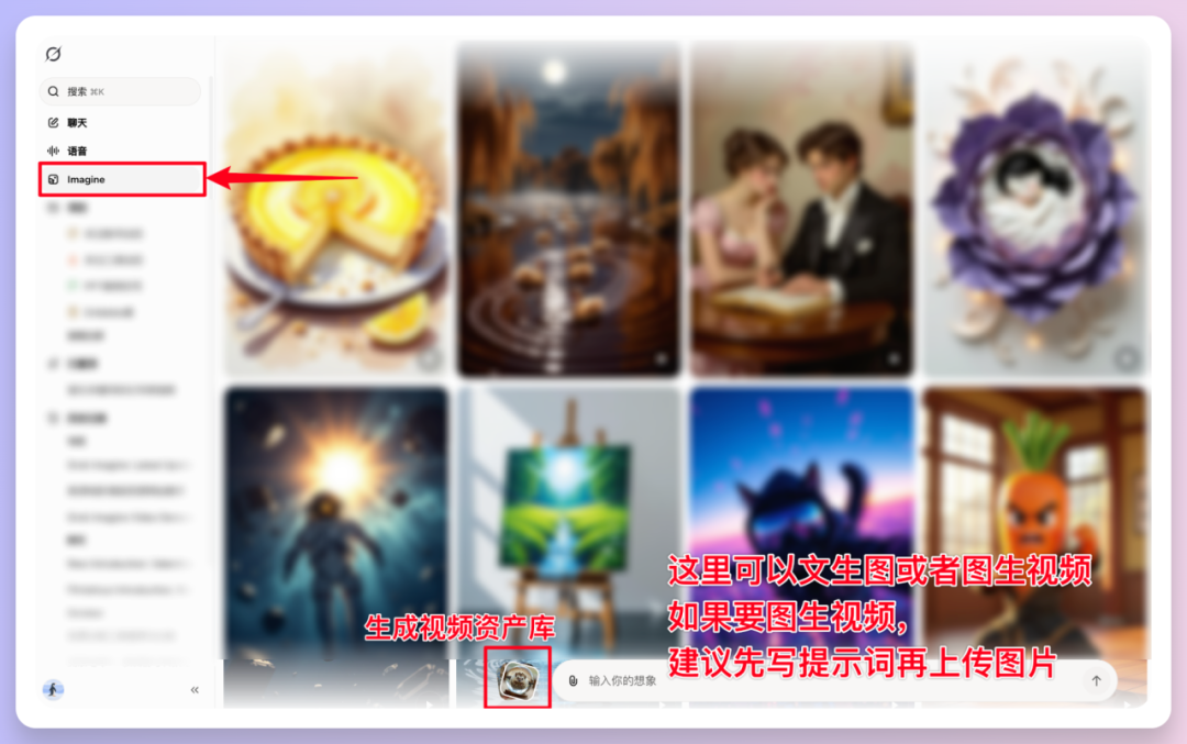 进入到Grok生图视频的Imagine页面后,可以进行文生图或者直接上传图片生成视频。我发现这里发送提示词+上传图片有bug,从这里图生视频不能遵循视频提示词,可以上传图片生成视频后再在视频下方对话框中重新输入提示词👇