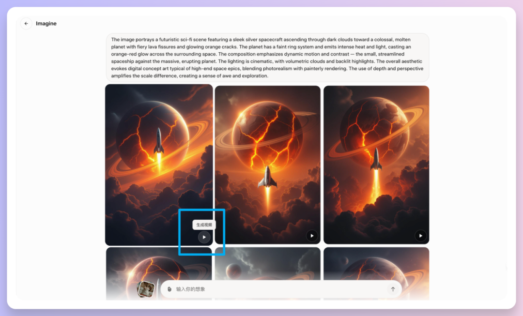 如果我们直接输入提示词然后生成图片后,会看到这个界面,点击满意的图片的右下角的图标即可键生成视频,可以选择多张(无需提示词)👇