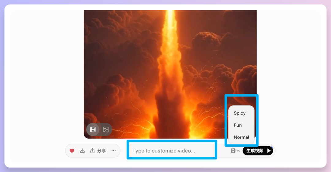 生成视频以后有4个模式,Normal(正常模式,生成安全、通用且高质量的图像或短视频)、Fun(趣味模式,更注重创意和幽默元素,能添加夸张、卡通化或意外的趣味效果)、Custom(自定义模式,通过提示词精细要求并点击生成视频)和 Spicy(辣度模式,18+ 需验证,主体不是人的时候可能没有这个选项)。