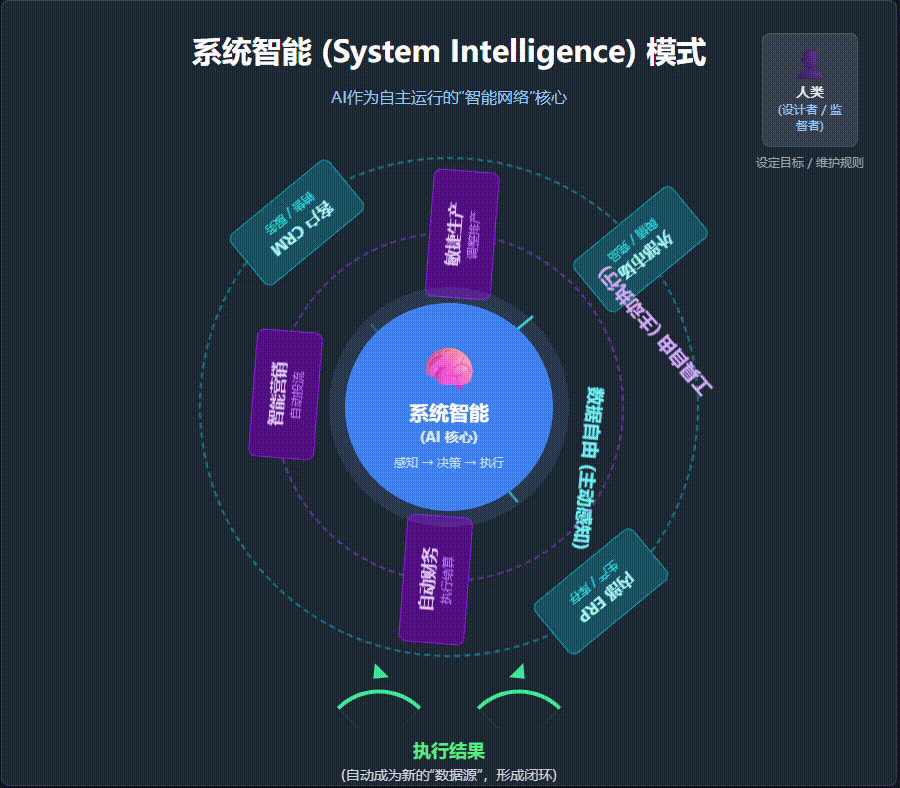 - 循环1(执行与学习):AIAgent网络(系统智能)基于已获得的“双重自由”,自主运行业务(例如:完成一次产品迭代和市场推广)。