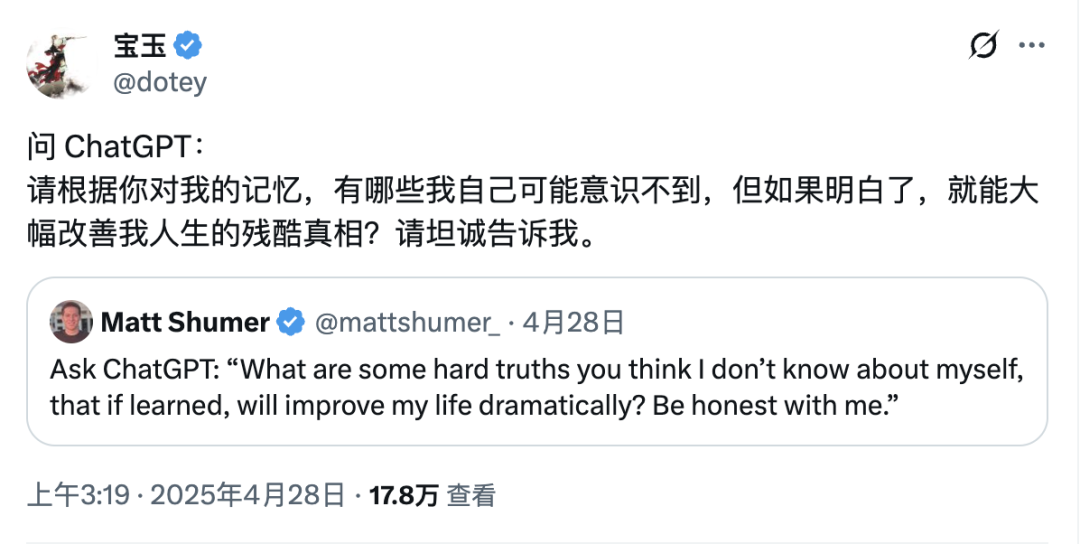 再把「完整的自己」丢给一个大模型,同时说出那句神奇的咒语——「请根据你对我的记忆,有哪些我自己可能意识不到,但如果明白了,就能大幅改善我人生的残酷真相?请坦诚告诉我。」