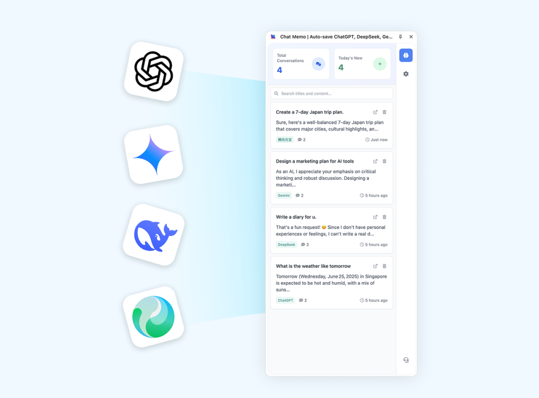 如果想更简单一点,可以在Chrome浏览器里装一个插件——Chat Memo,可以自动汇总你跟各个大模型的对话,目前支持ChatGPT, Gemini, DeepSeek, Claude, 腾讯元宝, 豆包等主流AI平台,你只需要在这个插件里把所有对话记录导出到本地就行。关键这个插件还是免费使用的,简直AI大模型重度使用者的福音。