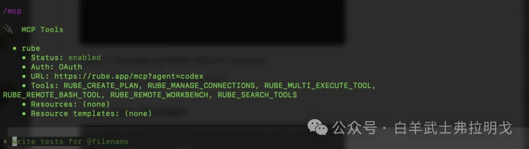 安装完毕后,先检查一下是否安装好了 rube,检查下是否安装成功:输入命令 /MCP