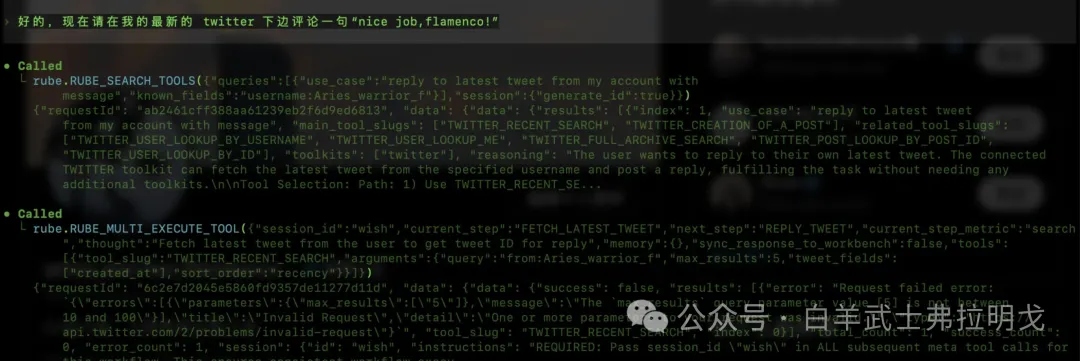 现在让 agent 自动在我的最新的 twitter 下边评论一句“nice job,flamenco!”