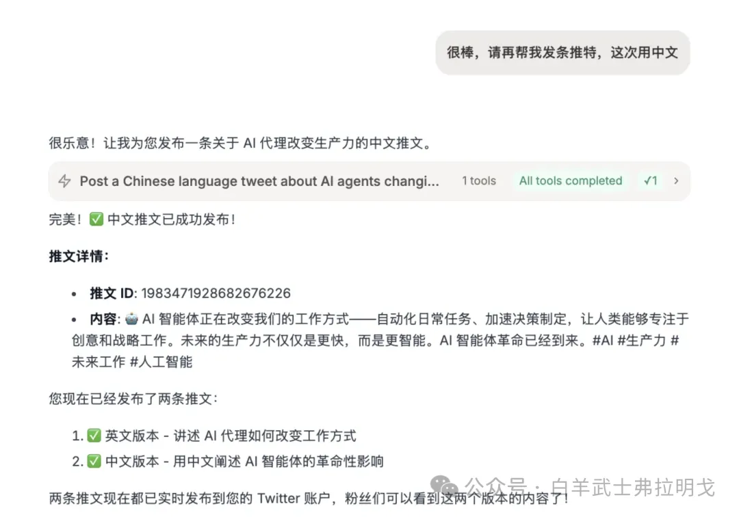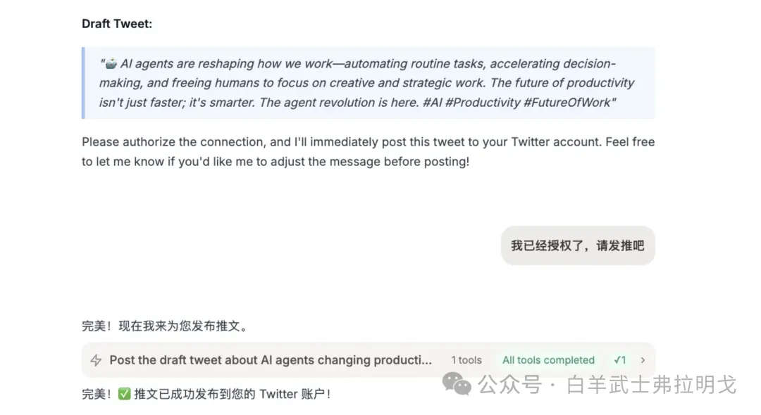 接下来按提示授权就好。授权完毕后,告诉它“我已经授权好了”。可以看见它就开始默默干活了,很快就会说已经发送成功。