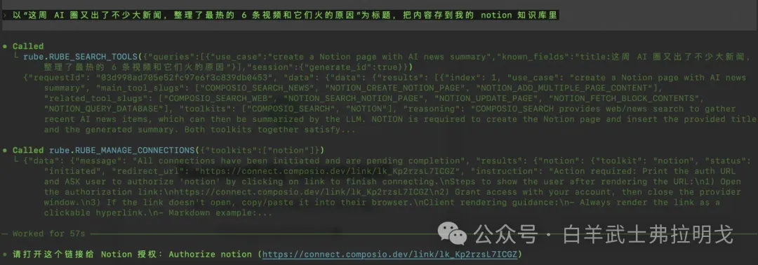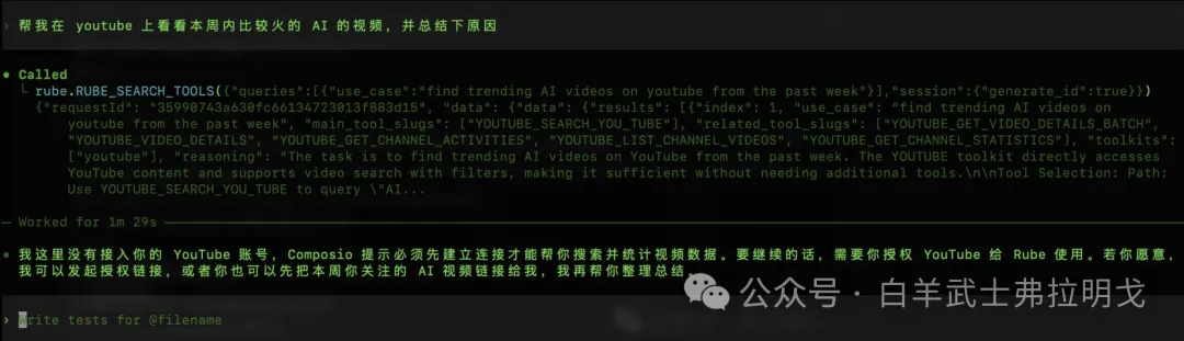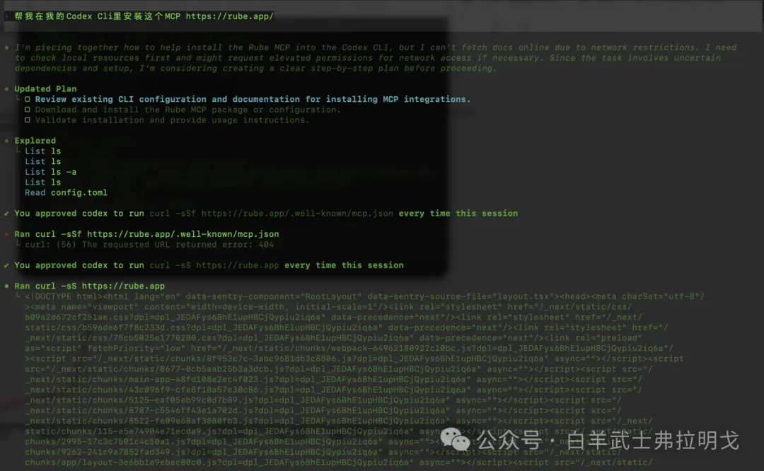 告诉它“帮我在我的 codex cli 里安装这个 MCP https://rube.app”然后就等它 kukuku 开始工作了。