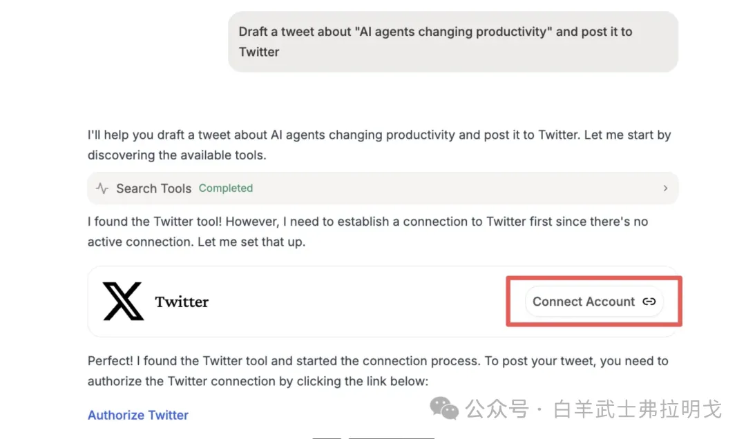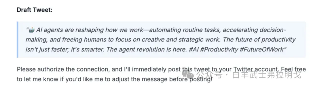 然后执行。接下来它会提示让我配置 twitter 链接,并呈现出来拟发送的推文信息: