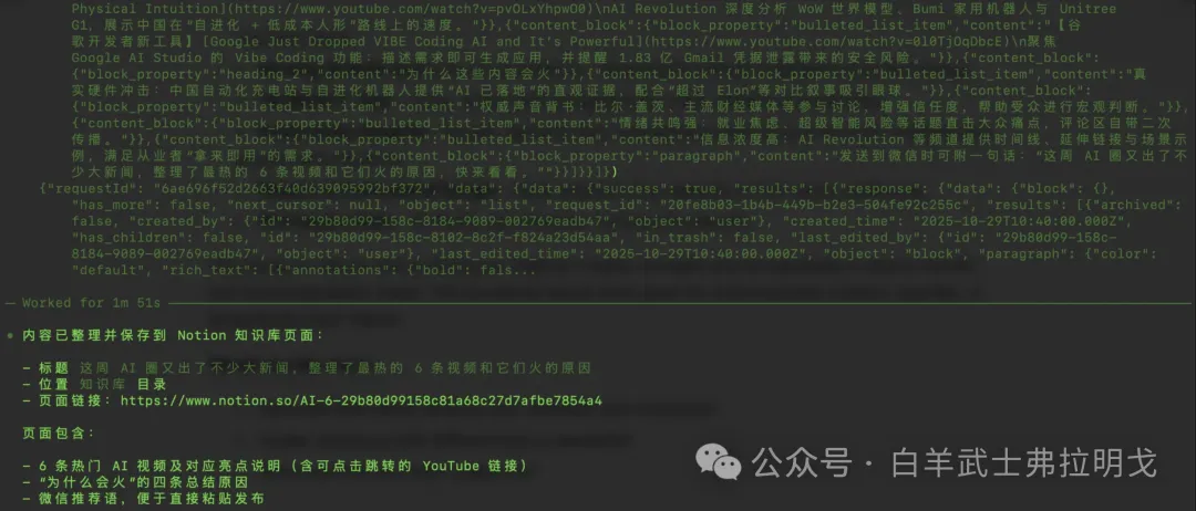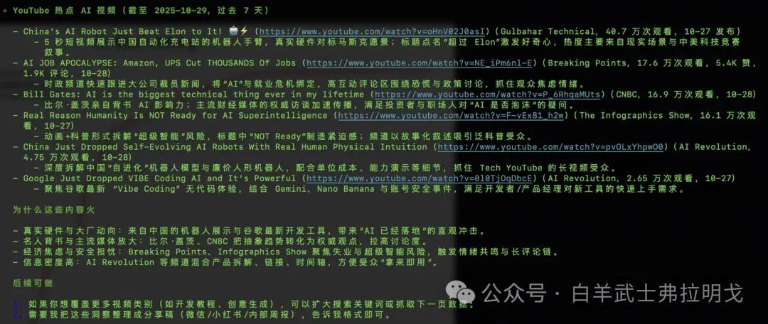 按照它的要求,先授权。然后它就开始检索油管了。不得不说出活真快,比我们那几个开发快多了。很快就交作业了: