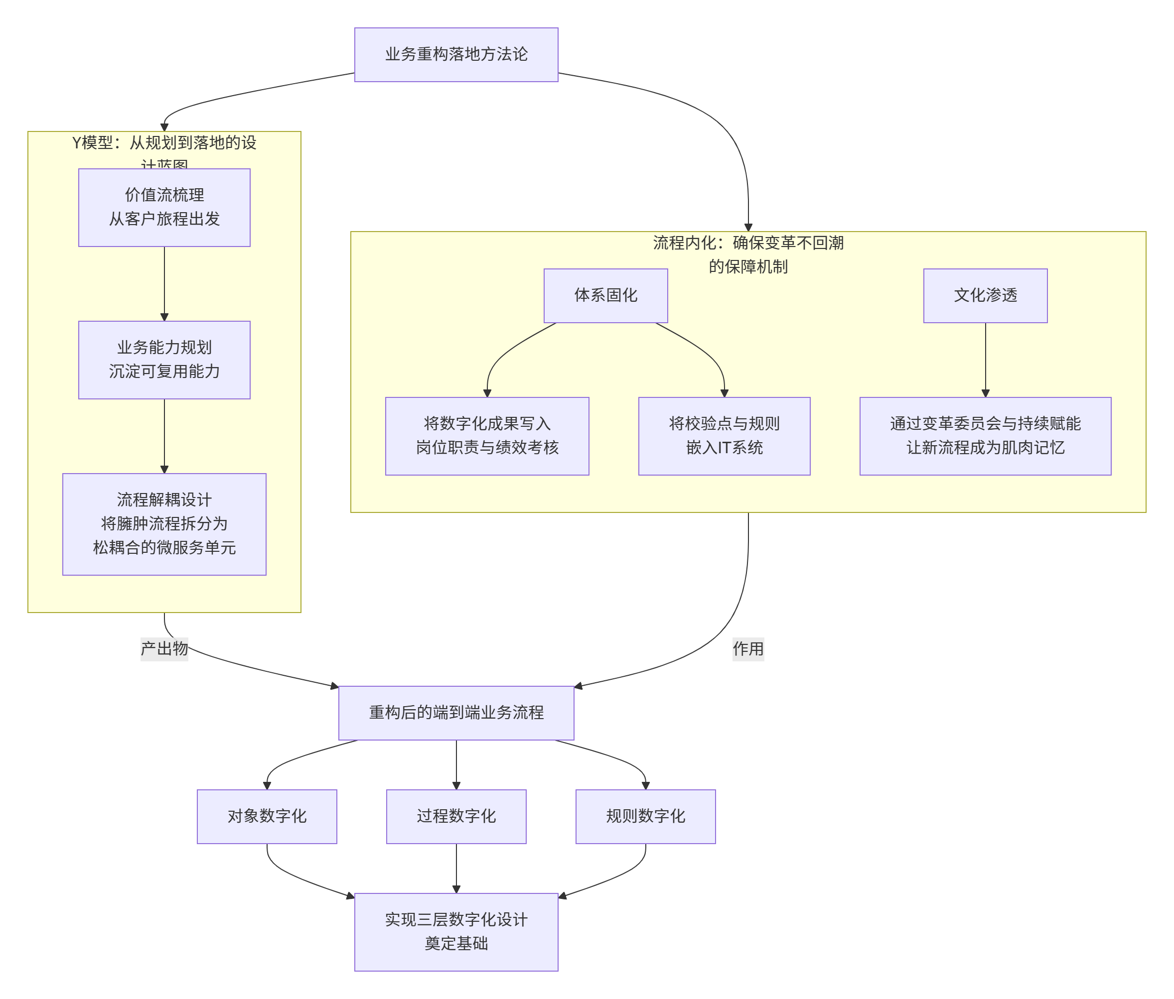 3.流程解耦设计 (“怎么做”)这是“Y模型”的收敛点,也是直接产出“三层数字化”成果的一步。它将价值流的需求和业务能力进行匹配,对传统的臃肿流程进行解耦,设计出松耦合、高内聚的微流程或服务单元。