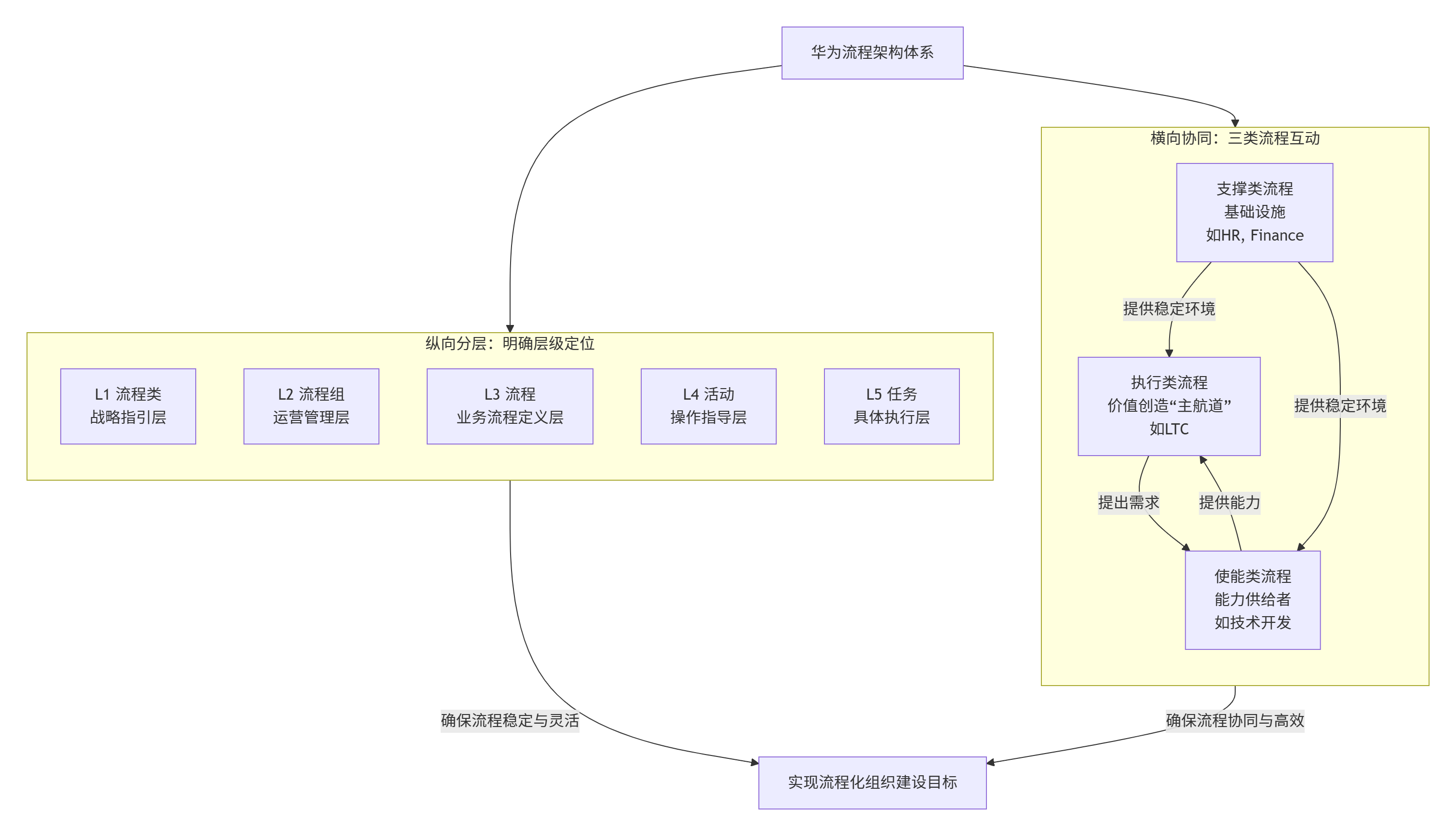 华为的流程架构支撑是一个精细化的系统,其核心可概括为“纵向分层、横向协同”。