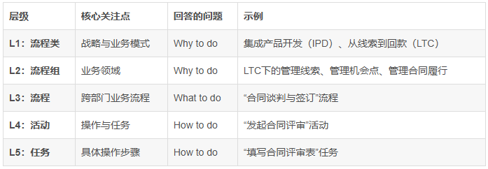 纵向分层(L1-L5):华为将流程架构分为五个层级(L1-L5),每一层都有其明确的定位和功能,确保了从战略到执行的无缝传导。