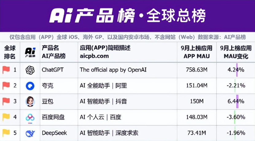 相较之下,夸克则是阿里更好的选择,其本身已经拥有亿级规模的用户群体。AI产品榜数据显示,今年9月,夸克的月活跃用户规模仅次于ChatGPT,豆包紧随其后。