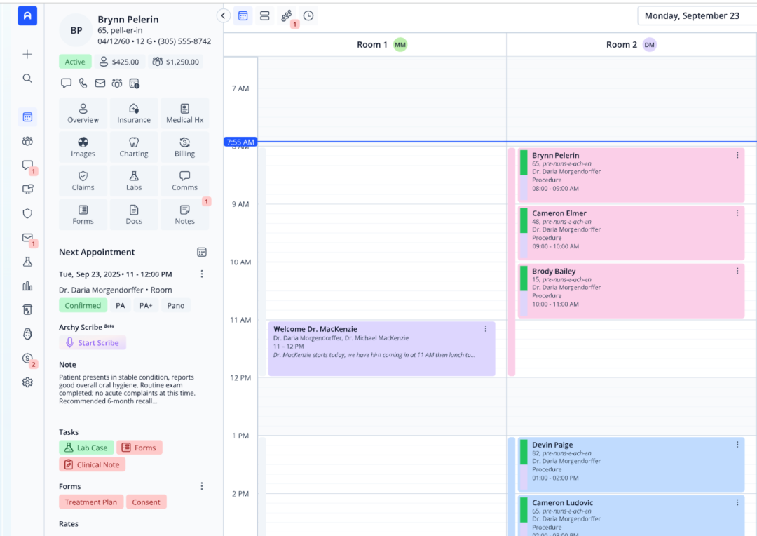 以儿牙诊所为例:过去团队把预约提醒、术后随访和欠费跟进分散在多款短信/表单/收款工具里,切换频繁、电话量大。换用 Archy 后,把在线预约、两向与自动化短信、病历与影像并到一个后台、在线预约明显压缩了前台接电话时间,且不再为第三方附加软件和本地服务器买单,院长Dr. Dan 估算至少节省了 3 万美元成本、上手期也更顺畅,兼职员工当天就能完成建档与看片。如今平台又补上 Ask Archy 的“问数据,出清单,一键执行”能力,用于拉取未回访/未支付名单并直接触达,进一步把这些高频小事“交给系统跑”。