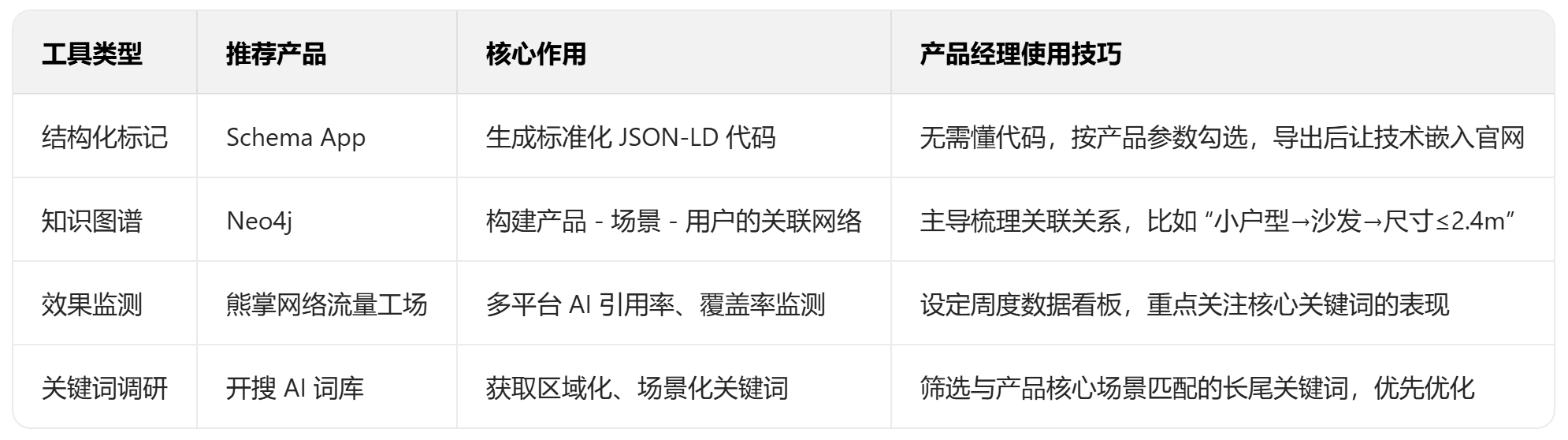 - 工具选型:产品经理主导选择适合的工具,无需依赖技术团队从零开发。比如用 Schema App 生成 JSON-LD 代码,用 Neo4j 构建产品知识图谱,用熊掌网络流量工场监测效果。