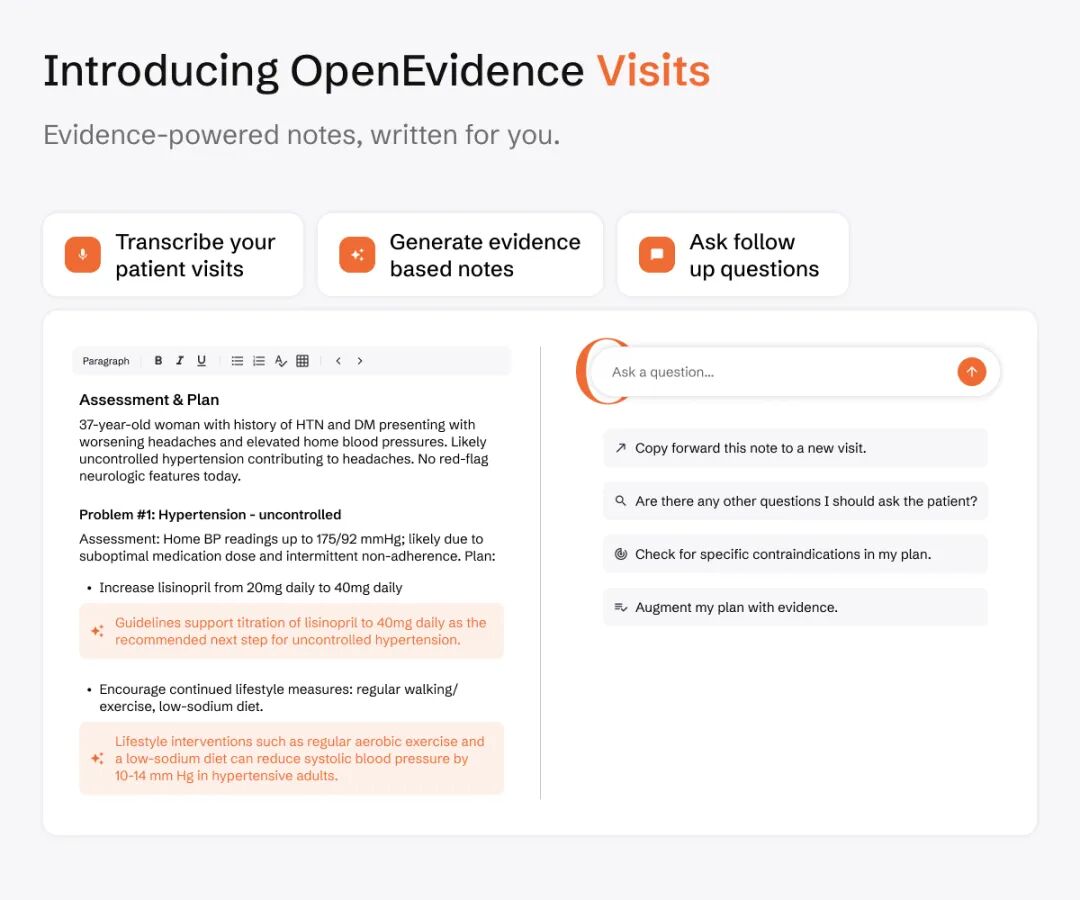 这背后是一个高度垂直化的 AI 引擎,它训练于数百万篇同行评审医学文献,并与顶级期刊(包括New England Journal of Medicine、JAMA等)建立了内容合作。