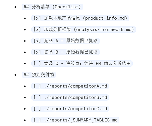 - 动作:AI启动并行处理。它严格按照analysis-framework.md的格式,为每个竞品生成独立的报告(competitorA.md,competitorB.md…)。