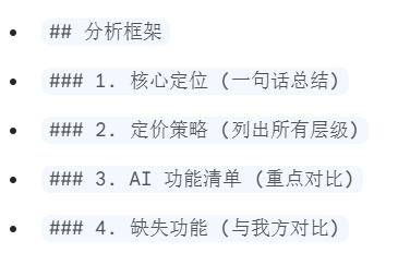 - 触发:在终端输入“启动新一轮竞品分析,重点关注AI功能”。