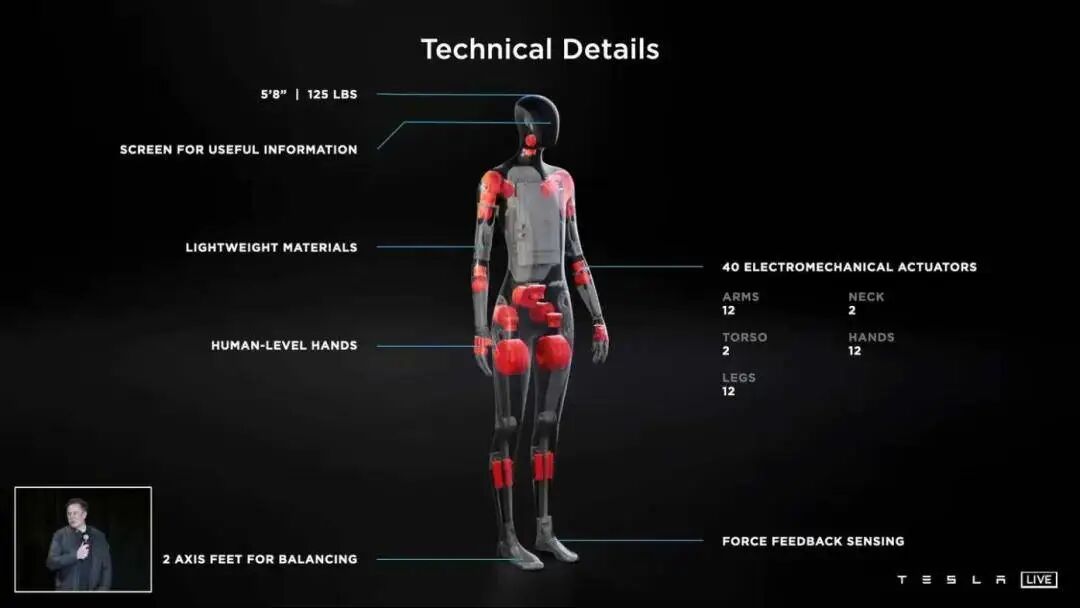 特斯拉对外发布了一些技术细节:全身采用轻量化材料,共有40个电动执行器 ——手臂12个 + 手部12个 + 腿部12个 + 颈部2个 + 躯干2个。