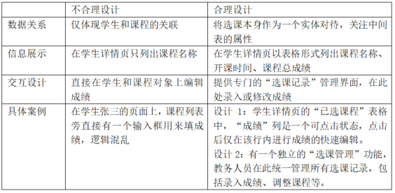 问题:学生与课程的多对多关系中,中间表通常存储关联属性,若页面只展示课程名称,会丢失核心业务数据(用户无法查看“课程开课时间或课程总成绩”)。