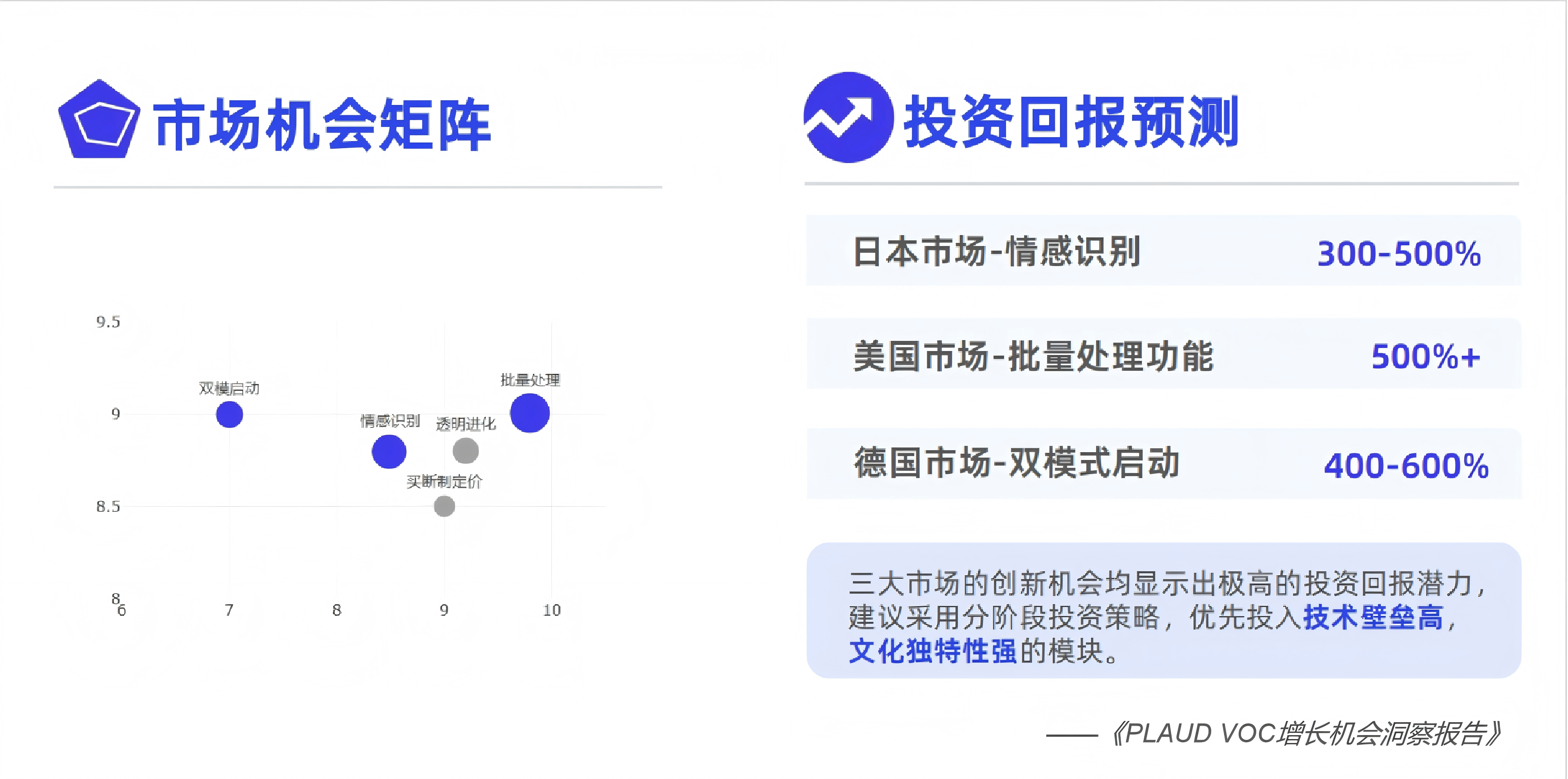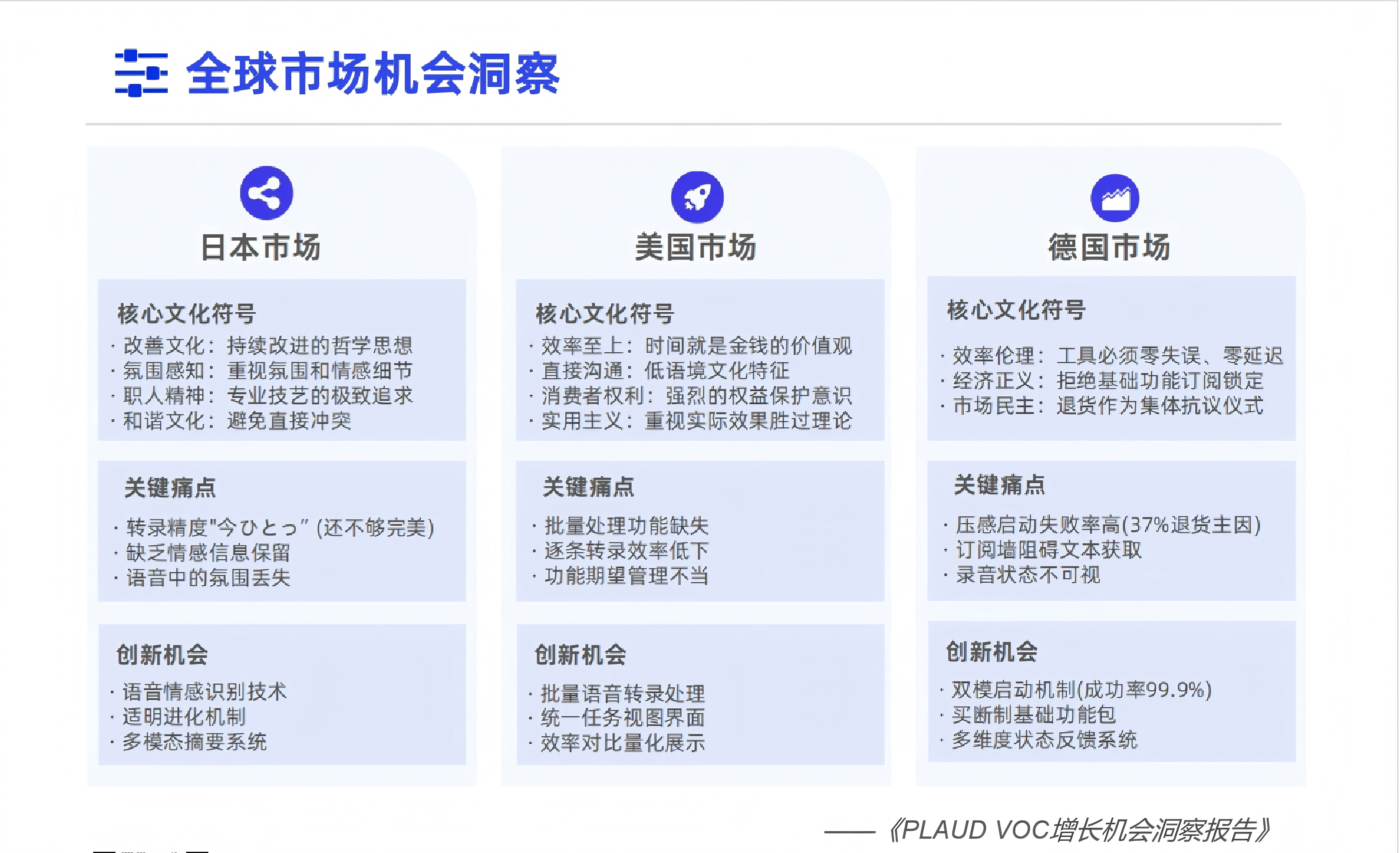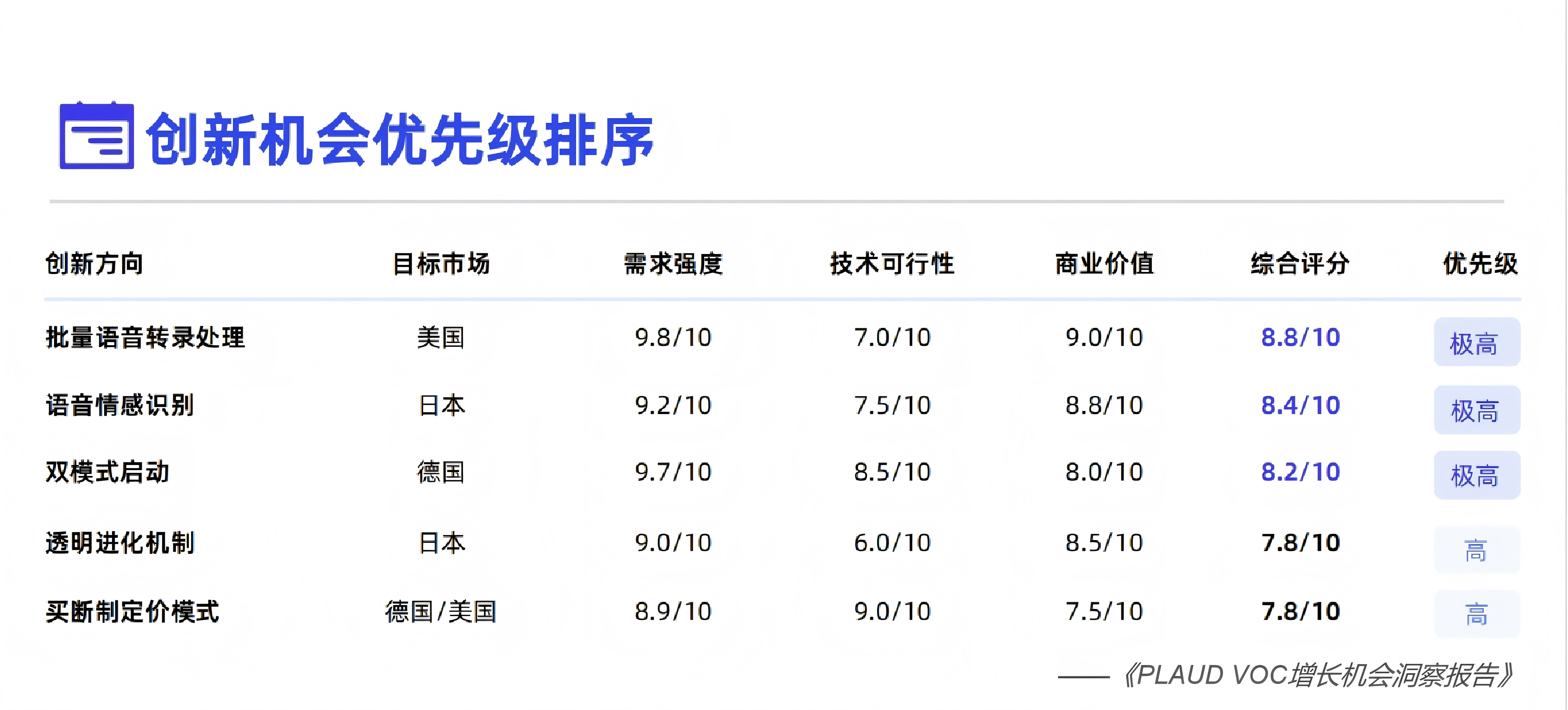 第一阶段聚焦高需求紧迫度的核心场景,快速占领市场。美国的批量语音转录处理(投资回报预测500%+)和德国的双模式启动(400-600%),均具备“高需求强度+高技术可行性”的特点,可作为优先投入方向;第二阶段优化情感与增值功能,如日本的透明进化机制与多模态摘要系统,提升用户忠诚度;第三阶段则可根据VOC(客户之声)动态反馈扩展功能,如美国市场的效率对比量化展示,德国市场的全天候续航升级等。