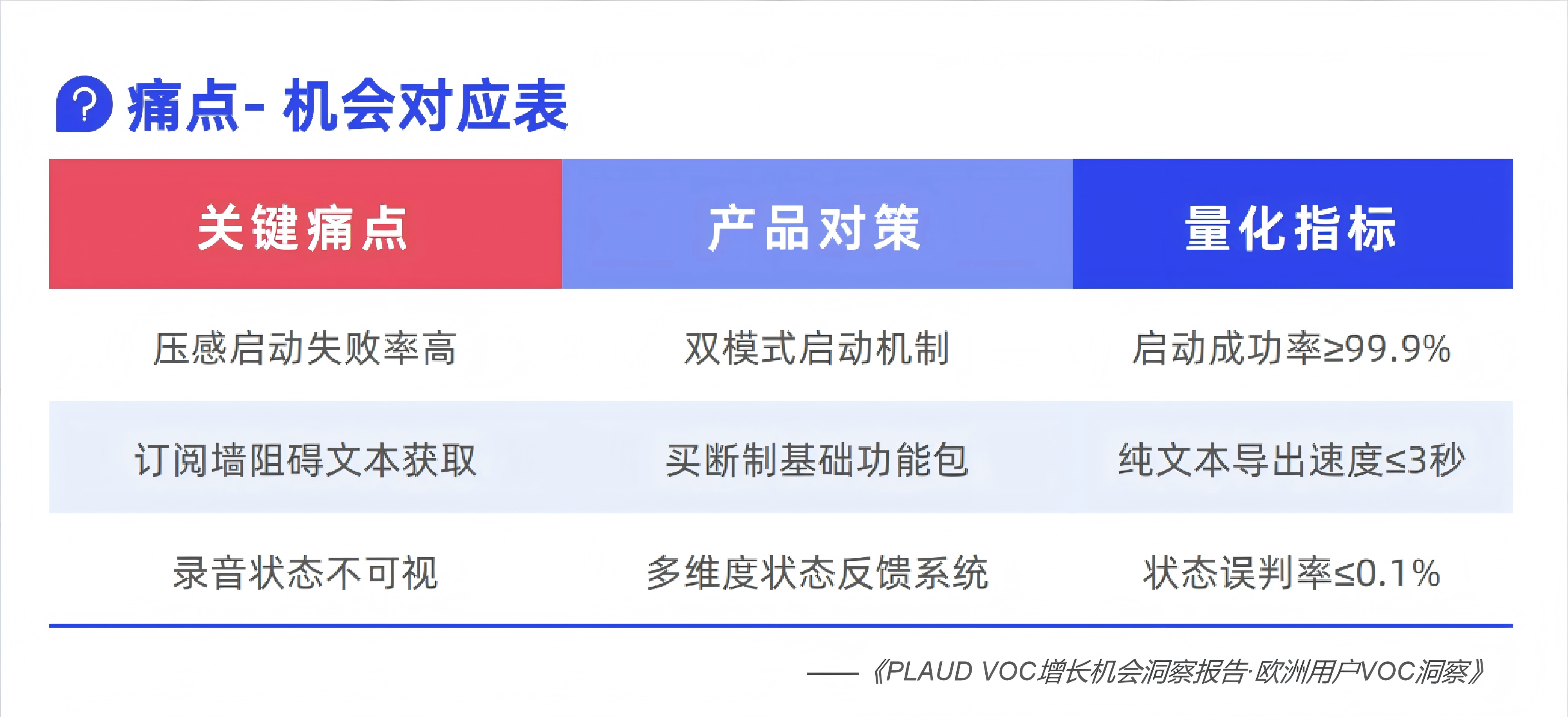 产品落地可以参考“场景-需求-功能-量化指标”的逻辑链条。针对德国新闻采访场景,推出物理键+压感+双击+远程的双模式启动系统,将启动成功率锁定在99.9% 以上;面向日本会议场景,打造“透明进化机制+情感识别”功能组合,通过月度报告可视化精度提升过程;聚焦美国办公场景,开发批量语音转录处理与统一任务视图界面,直接解决逐条转录效率低下的痛点。这种精准匹配的产品策略,正是“痛点-解决方案-产品定位”逻辑的实践应用。