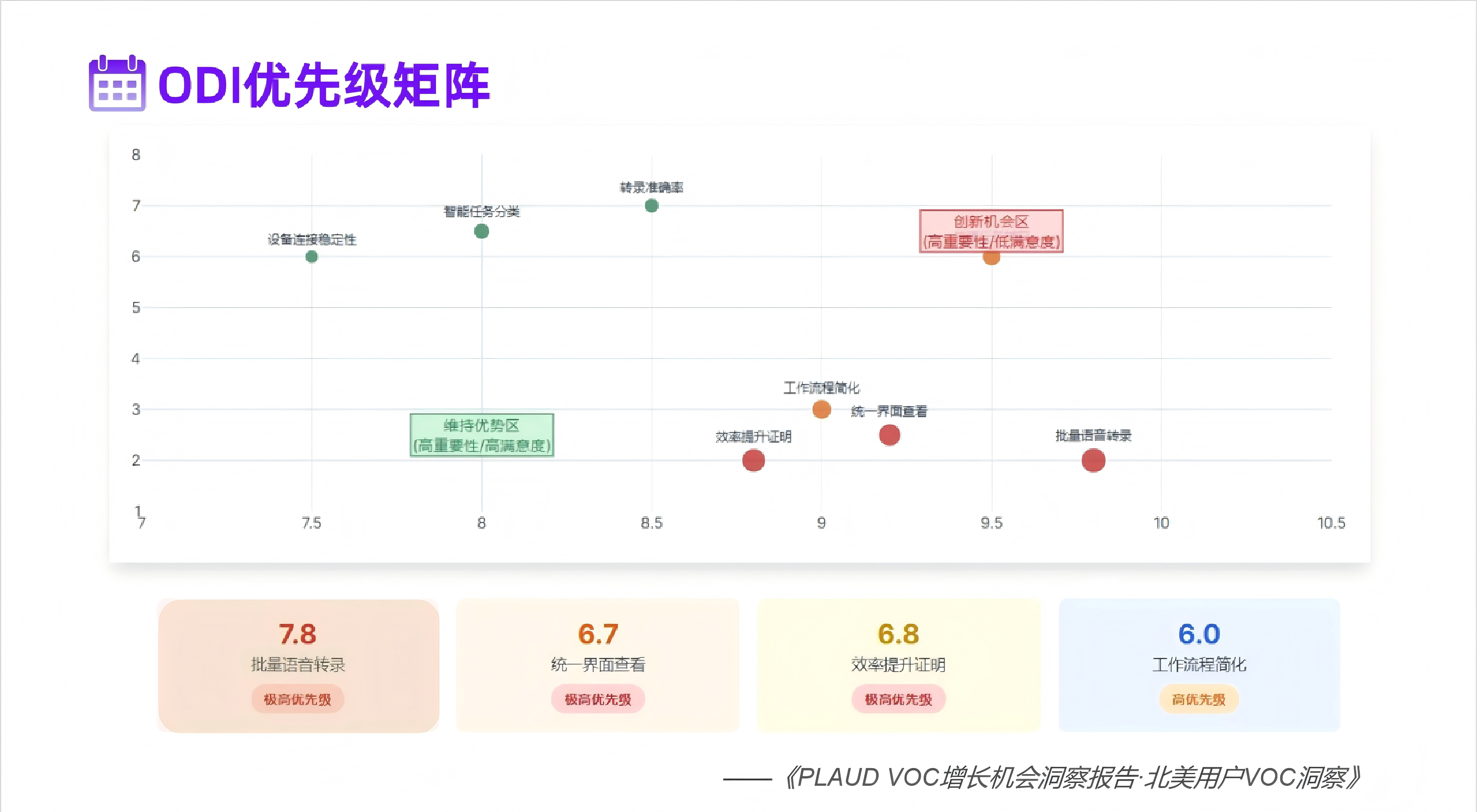 美国市场则被“高效办公场景+效率至上文化”主导。37%的退货源于批量语音处理功能缺失,用户直言“处理小语音笔记的时间比写纸笔笔记还长”。这里面的需求本质是“效率最大化”,时间成本敏感度成为衡量需求优先级的核心指标,批量转录功能的需求强度高达 9.8/10,正是这种文化逻辑的直接体现。