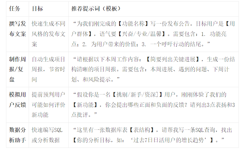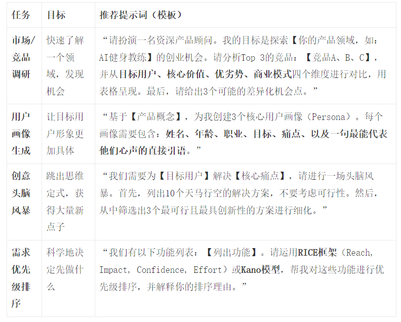 - 扮演角色(Assign a Role):在提示词开头让AI扮演特定角色,如“你是一名资深的产品总监”、“你是一名挑剔的早期用户”,这会极大改变输出的质量和角度。