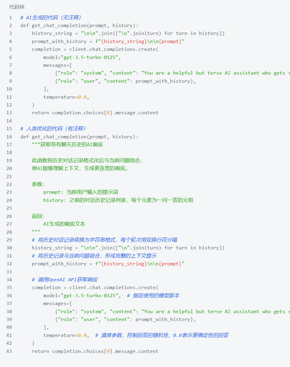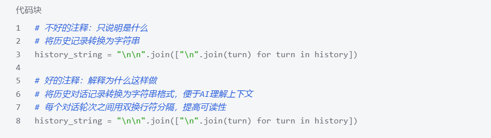 ChatGPT能生成功能代码,但无法理解你的业务逻辑、团队规范和长期维护需求。想象一下:当AI生成的代码需要紧急修复,或者交接给新同事时,没有注释的代码就是一场灾难。