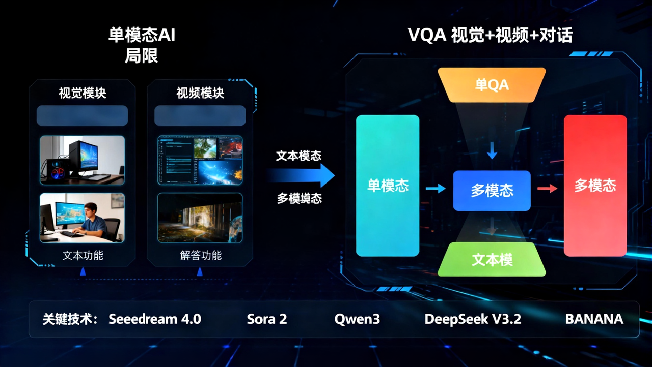 这些“看得见、想问问不出、问了难解答”的场景,正是单模态AI的短板所在。过去,纯视觉AI能识别物体却不会对话,纯文本AI能答疑却缺乏具象关联,纯视频AI能展示却无法互动。而如今,随着AI技术从“单模态感知”向“视觉-视频-对话”全栈融合跨越,一种全新的解决方案——VQA(Visual Question Answering,视觉问答)多模态技术应运而生。