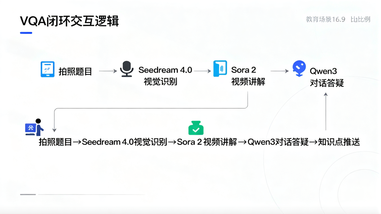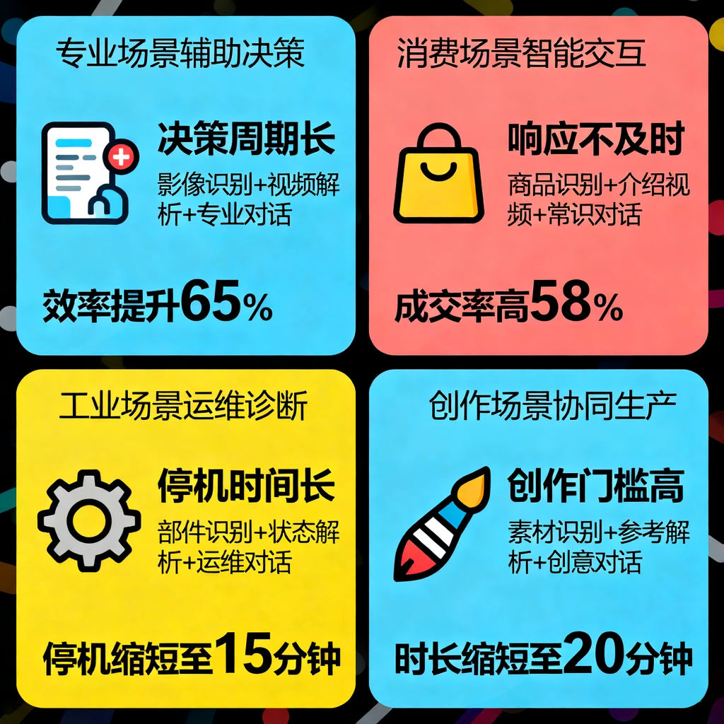 在教育领域,学生用VQA产品拍照题目(视觉输入),系统生成解题步骤视频(视频解析),还能实时解答“这一步为什么用勾股定理”(对话交互),最终解题效率提升82%,产品付费转化率提升45%;在医疗领域,基层医生上传患者CT影像(视觉输入)、手术教学视频(视频解析),系统能快速给出诊断建议(对话交互),诊断效率提升65%。