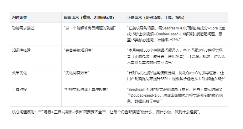跨团队沟通中,最容易出现的问题是“产品经理说的需求,技术团队理解错了”。尤其是VQA涉及多工具协同,模糊的表述会导致开发方向偏离。以下是“错误话术vs正确话术”的对比: