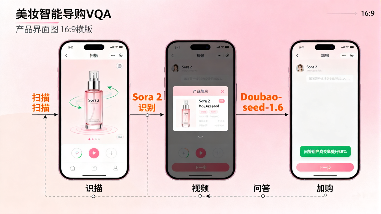 - 交互流程:用户扫描产品包装→Seedream 4.0识别核心信息→Sora 2自动生成上妆视频→用户可输入问题(如“敏感肌能用吗”)→Doubao-seed-1.6实时解答→底部展示“加入购物车”入口。
