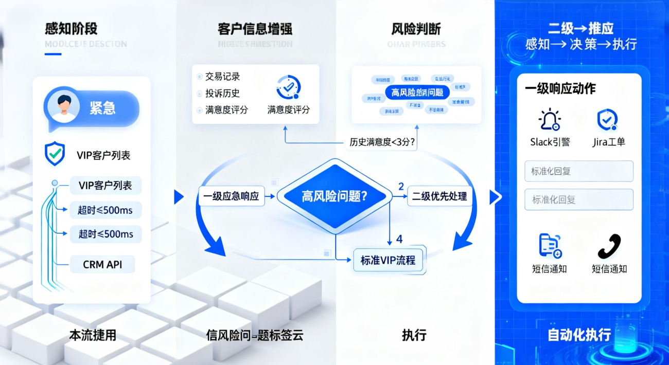 信息增强:如果触发条件满足,立即检索该VIP客户过去12个月的交易记录、历史投诉记录和客户满意度评分。