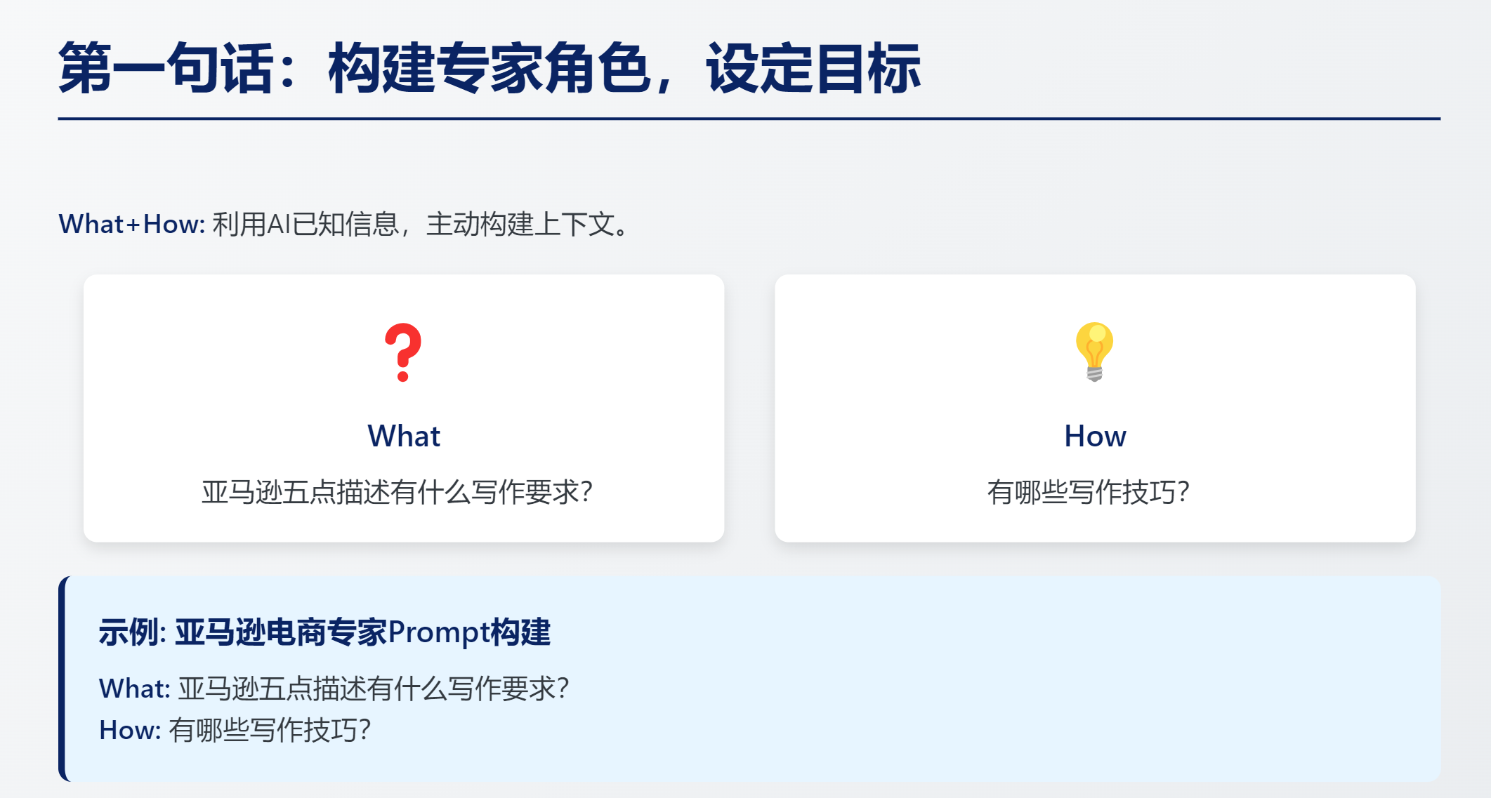 eg. 以构建一个亚马逊电商专家为例去调教一个提示词,就是:亚马逊五点描述有什么写作要求,有哪些写作技巧?