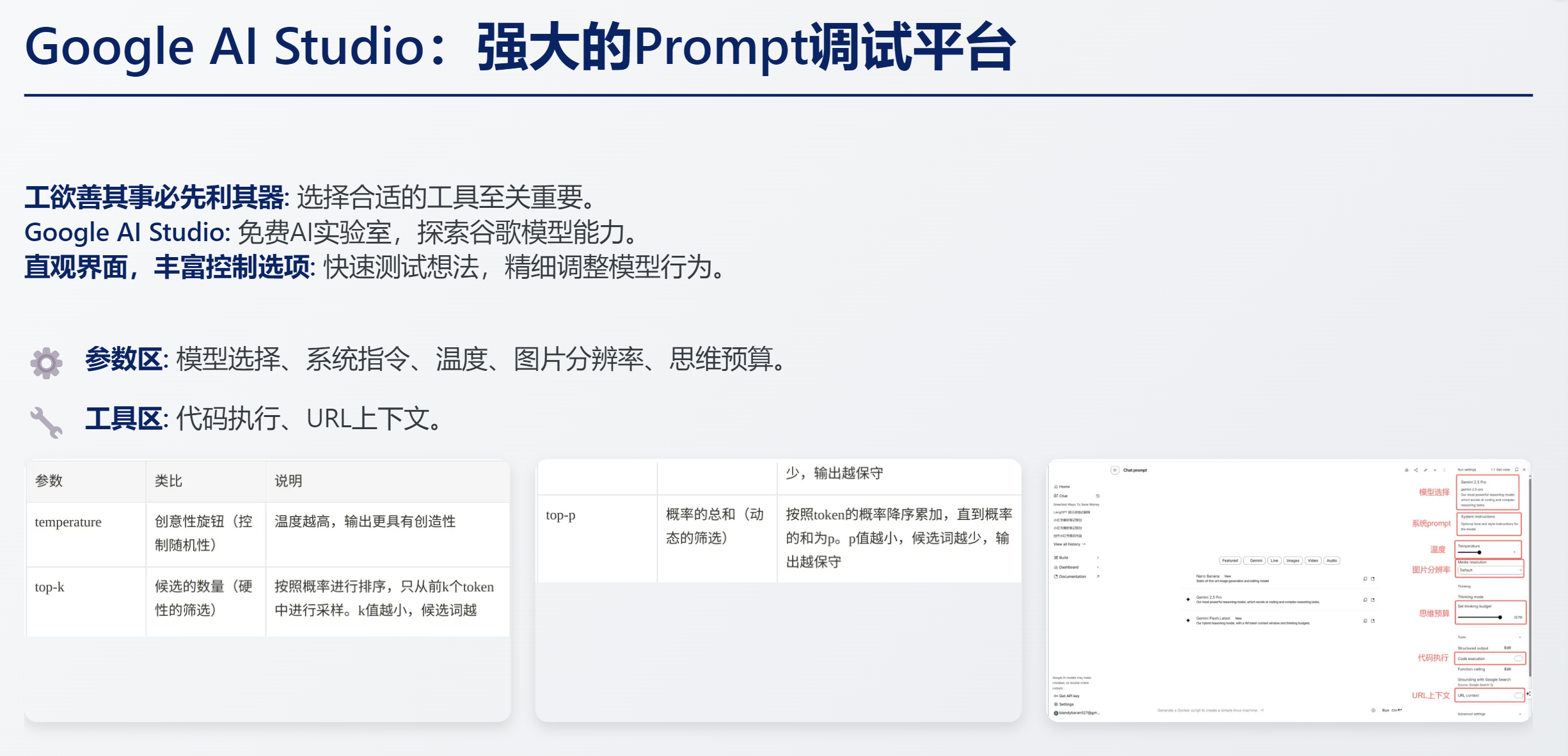 工欲善其事必先利其器,先介绍一个工具——Google AI Studio(谷歌人工智能工作室)。无论你是AI行业的开发者还是日常使用的普通用户,无论你是想快速测试一个想法,还是精细调整模型行为,都可以通过这个平台去实现。简单来说,它有直观的界面和丰富的控制选项,就像一个免费的 AI 实验室,在里面可以尽情探索Gemini、Veo、Lyria等谷歌模型的能力,得到想要的结果。