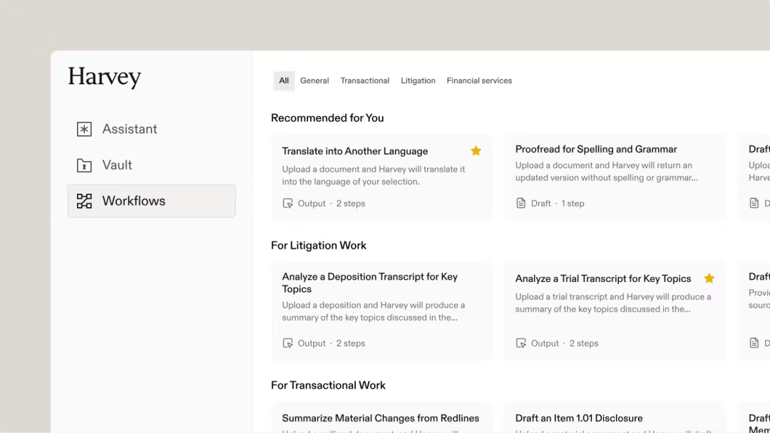 例如,用户可以设计一个“合同尽职调查”工作流,由Harvey自动依次提取合同要点、核对标准条款并生成报告;也可使用Harvey预置的NDA审核工作流,大幅缩短了初始审查时间;
