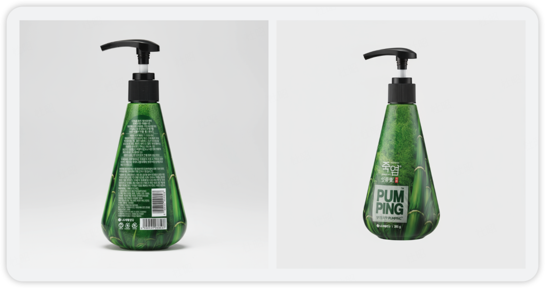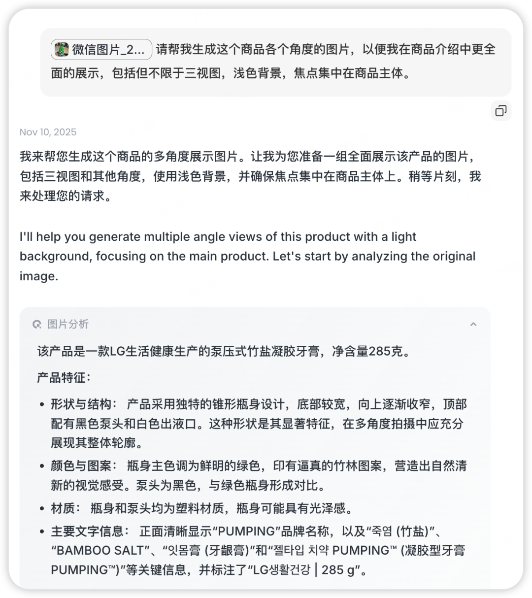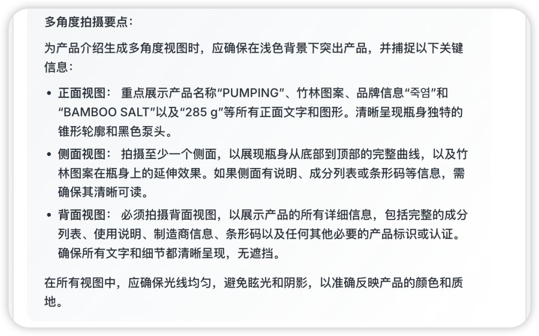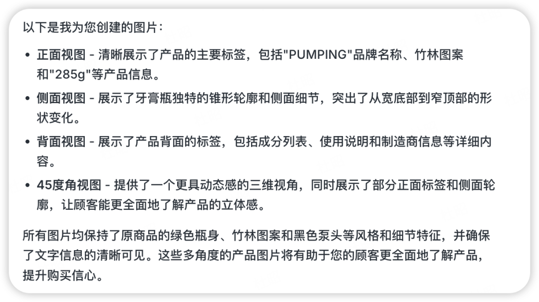 然后是背面视图和45度视图,背面视图是模型根据商品信息补全的一些常规信息,看起来像模像样,这里有一点惊喜的是,虽然我在提示词中提到了“三视图”,但lovart并没有为我生成顶部视图,而是选择了45度视图,可能是模型在思考过程中判断出了这种商品的顶部视图没什么意义?(想象一下瓶子的顶部视图有啥意义)