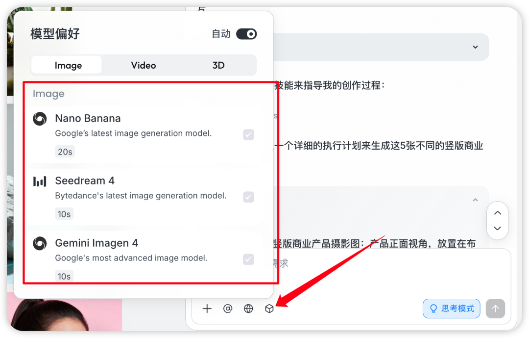 那么作为设计Agent而不是生图模型,lovart支持了非常多模型,现在公认的顶尖模型例如NanoBanana、Seedream4、Kling、Veo3、Sora2、Midjourney等全都有,在对话框下方可以选择模型偏好: