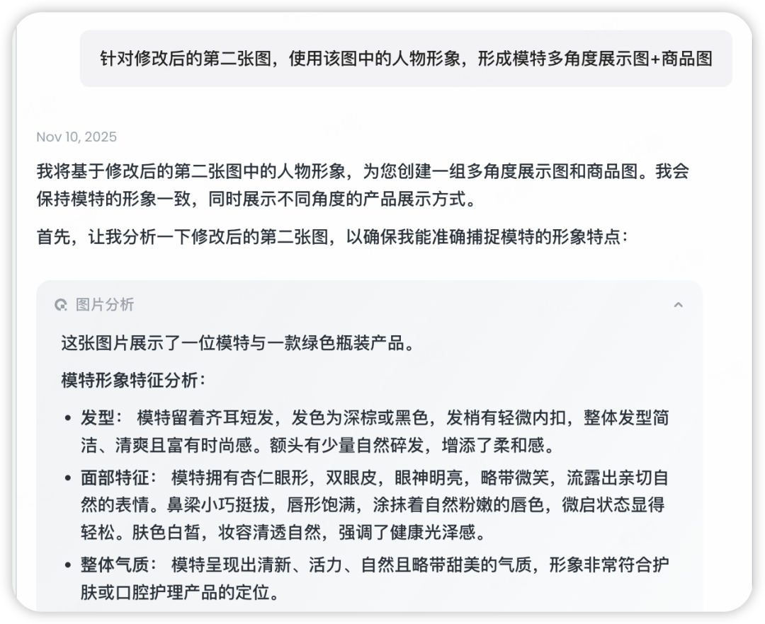 这里我比较喜欢第二张图中短发模特的形象,所以进一步要求根据这个模特的形象生成更多姿态的结果。lovart的思考过程先是对模特形象特征进行了分析,以保证后续人物形象的一致性。