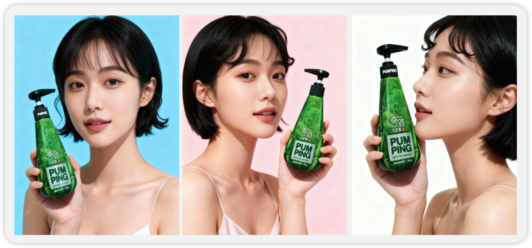 效果很不错,尤其是手部细节没有出现错误,侧面双手捧着商品、单手握持、单手拎起等姿态都不错,商品图本身的细节也保持了参考图片中的细节。