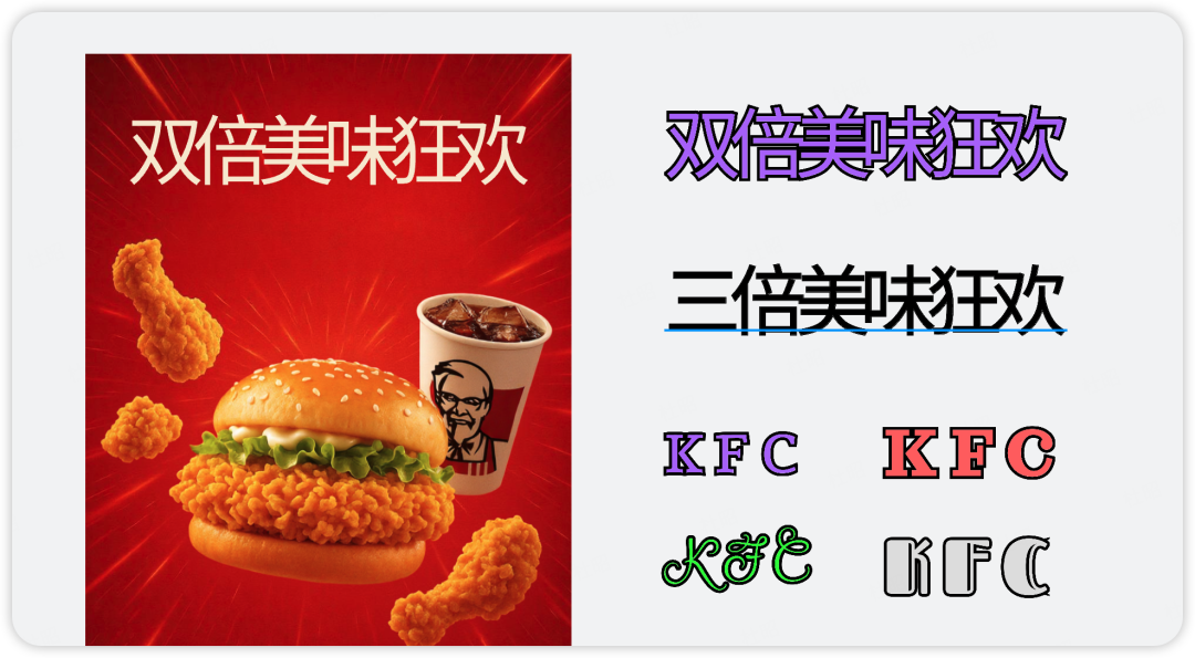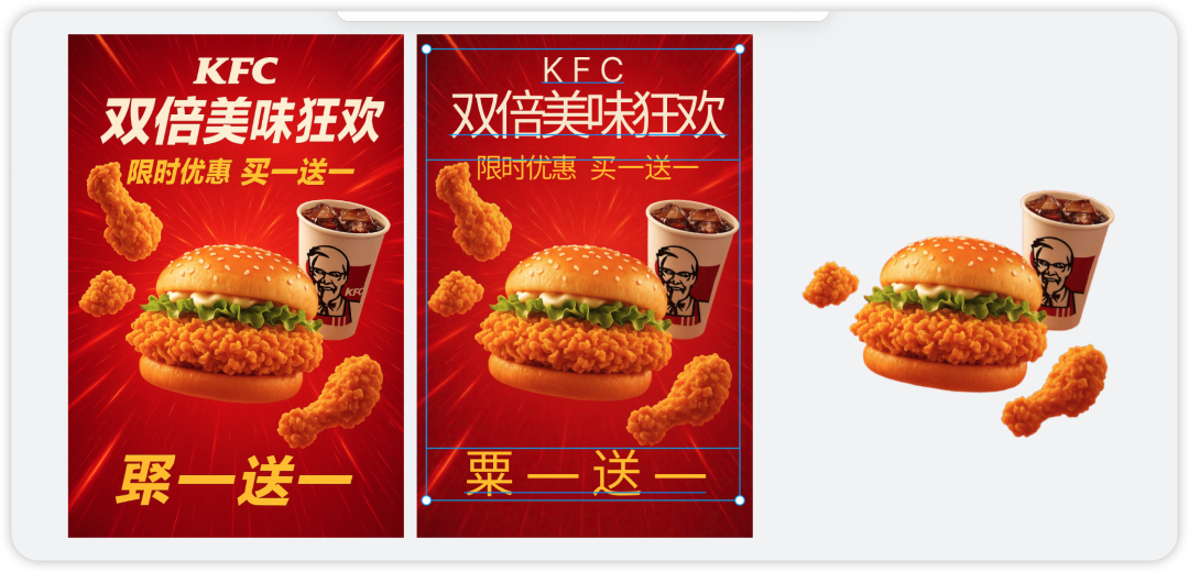 例如这里我可以把牙膏部分调整位置、调整透明度、放大缩小、单独下载等等,对于包含更多元素的图片同样也可以完成分层,比如下面这张KFC的海报就可以把不同文字和图片分成了4个图层。