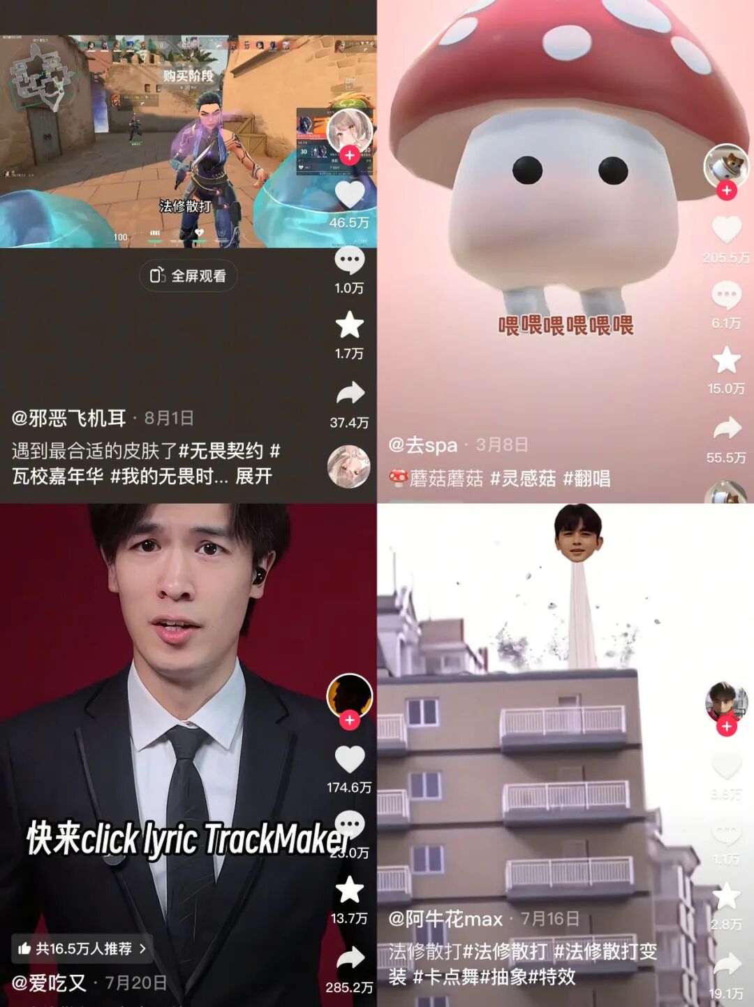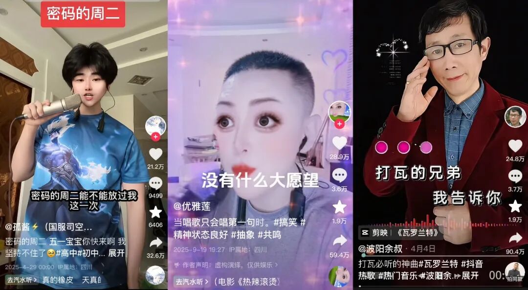 此外,类似于120年前的瑞典童子军军歌《Ging Gang Goolie》改编的《灵感菇》、以及日本歌曲《室内系的TrackMaker》中文版中“FashionCenter”发音空耳形成的《法修散打》等歌曲,因歌词包含谐音梗,其重复性结构与魔性发音形成记忆点,后经网友二次创作、翻唱成更抽象的视频内容,进一步扩散传播,也成了最热门的BGM,共计创下至少100亿话题播放。