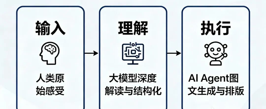它的全过程是:一段人类的原始感受(输入)→大模型的深度解读与结构化(理解)→AI Agent的图文生成与排版(执行)。