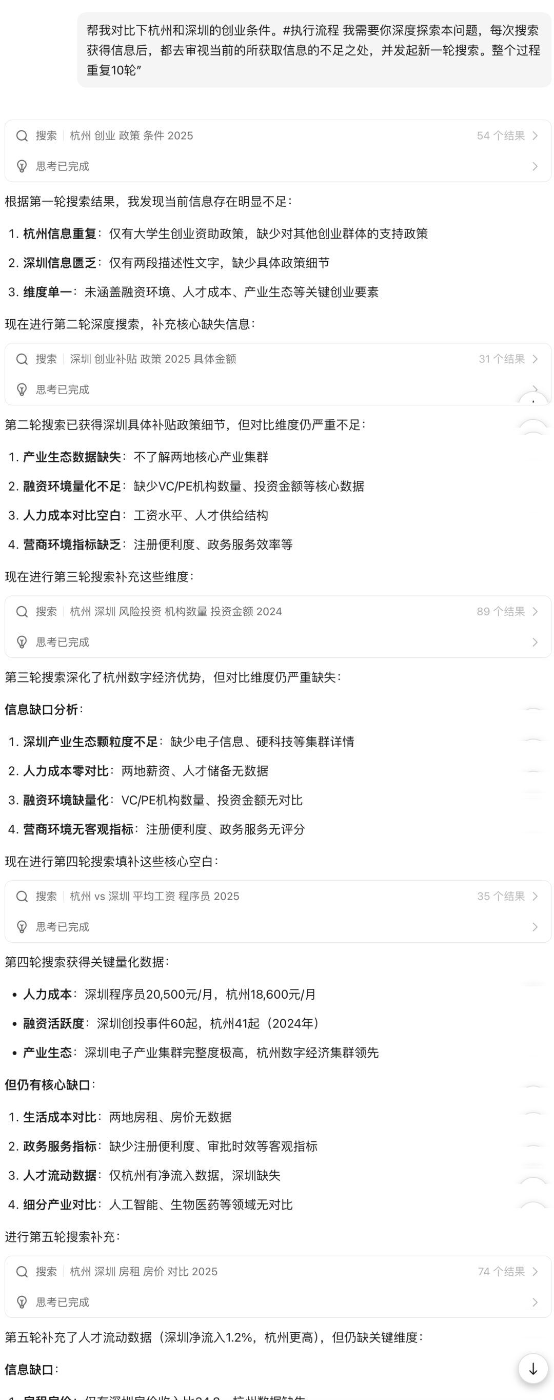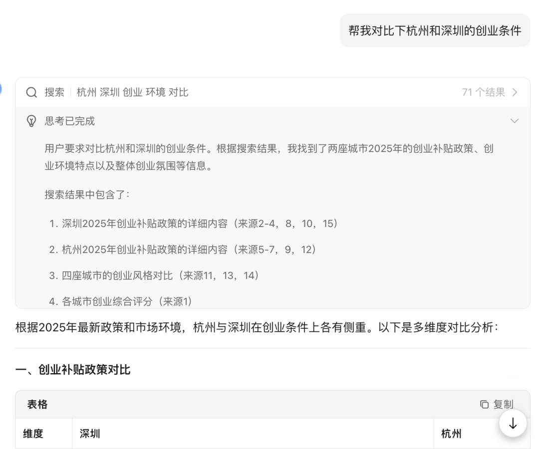 比如这样一条指令“帮我对比下杭州和深圳的创业条件”,你会发现模型的确搜索了,思考了,并给出了结果,但并没有刚刚令人惊讶的深度求索过程。这是为何?