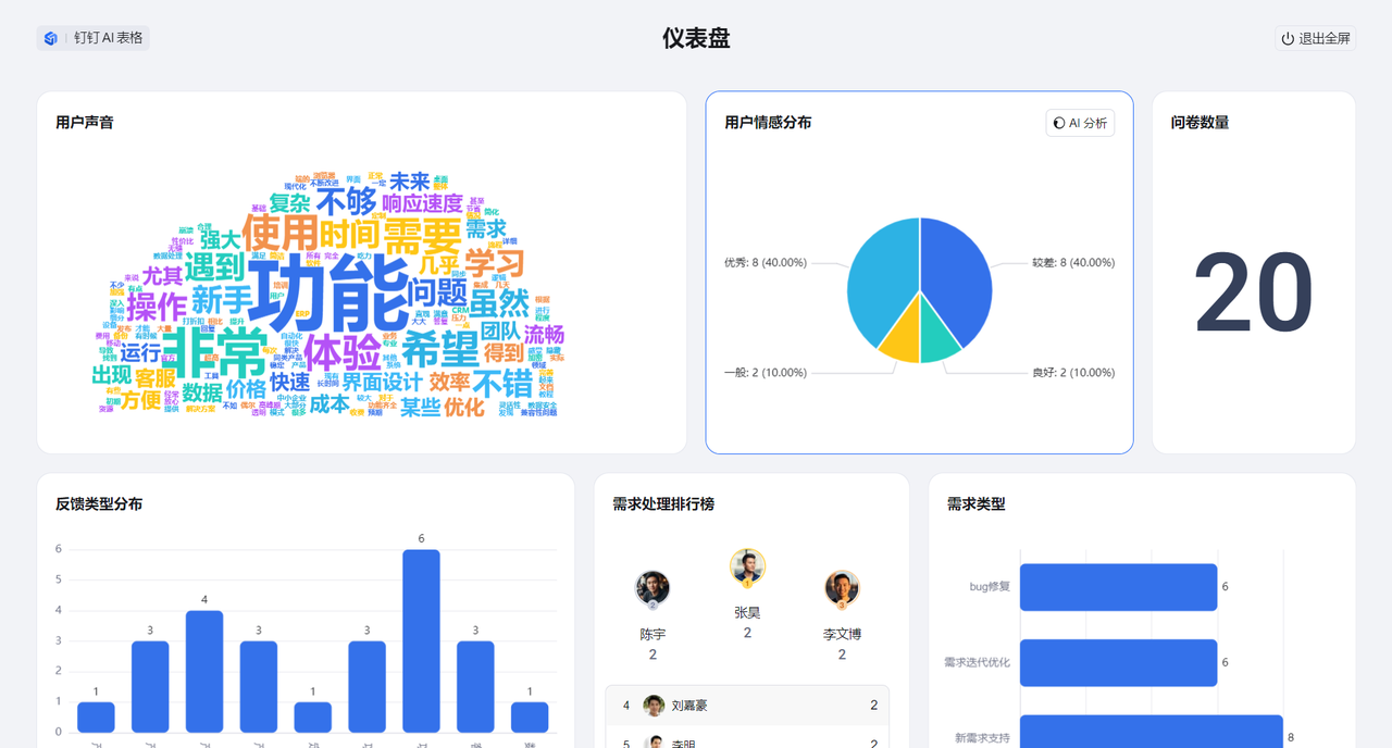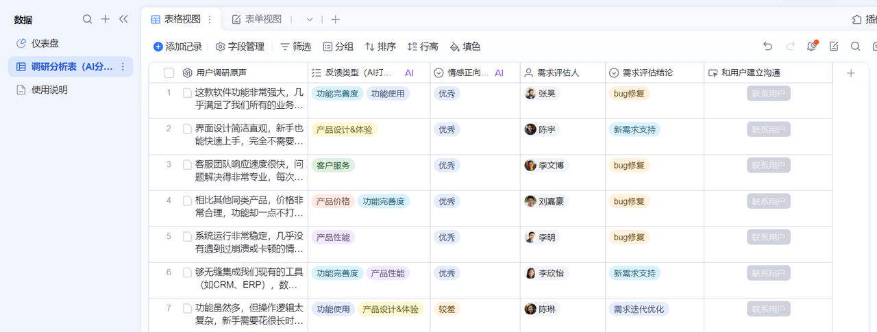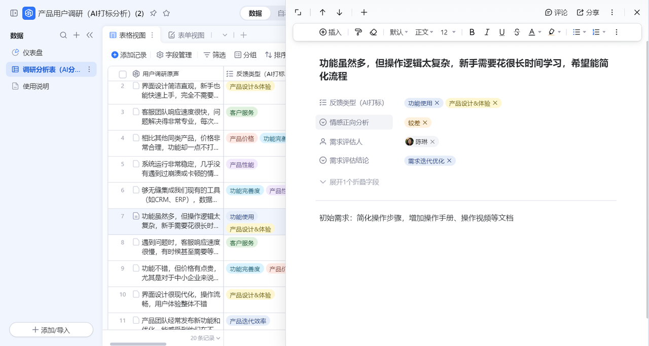 我把需求反馈直接做成线上表单,然后发给各个部门的人员,其他人员提交了表单,我这边可以立马收到通知,更进一步的是,我还会让AI表格“打类型标签”以及“做情感分析”。这样一来,我能迅速抓住用户的核心诉求和情绪重点,比如发现很多人都在抱怨某个功能的“操作繁琐”,或者对某个新功能“赞不绝口”。