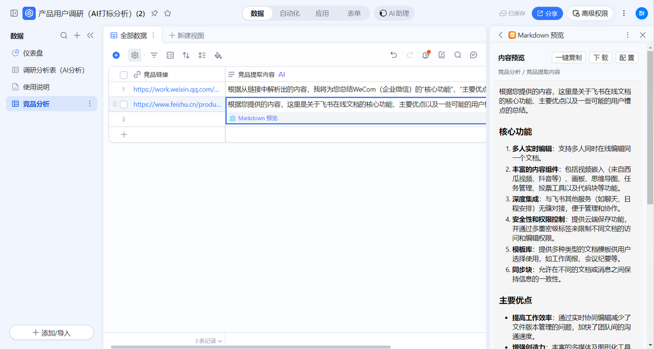 我直接把竞品的产品链接丢进去,然后让AI“帮我提取出‘核心功能’、‘主要优点’和‘用户槽点’,并分别填到右边的列里”。AI能很好地理解文本并进行信息结构化,省去了我大量的整理时间。当我需要快速对比几个竞品在某个特定功能(比如“在线表格”)上的用户槽点时,用条件筛选一下,结果立刻就出来了。
