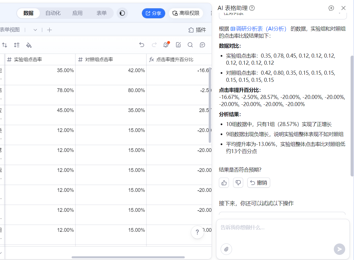 用了AI表格之后,我直接把A/B测试的原始数据(比如用户ID、分组、关键行为点击次数、转化情况等)导入到AI表格中,直接向AI助理提问: